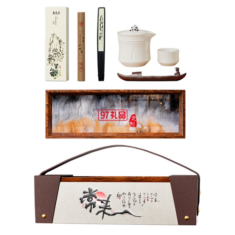 菲米茶具套組*1、白茶*1、折扇*1、香爐*1、線香*1、流動沙畫*1